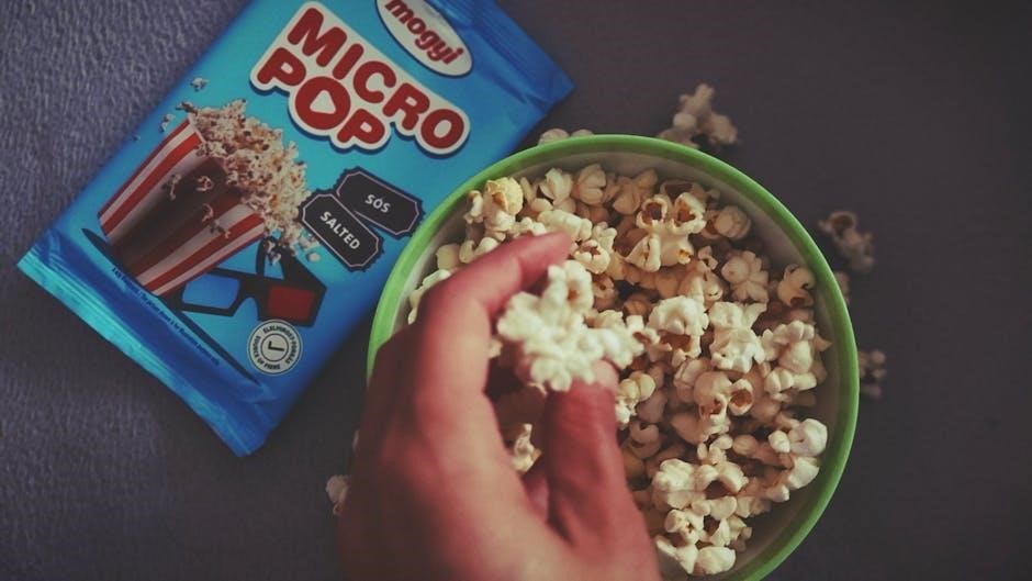 Once your popcorn is ready, it’s time to savor the delicious results! Transfer the freshly popped kernels to a serving bowl and enjoy as a snack on its own or with your favorite toppings․ For a cinematic experience, pair it with melted butter, salt, or creative seasonings like cheese powder or caramel․ Experiment with flavor combinations to find your perfect match․ Share with family and friends, or indulge in a cozy movie night․ The effort put into crafting homemade popcorn ensures a rewarding and tasty experience every time․